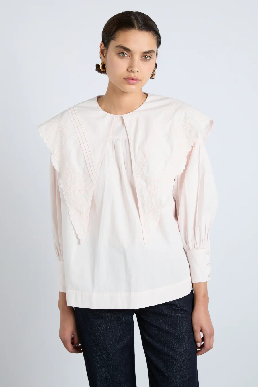 Oversized, embroidered pointed collar.