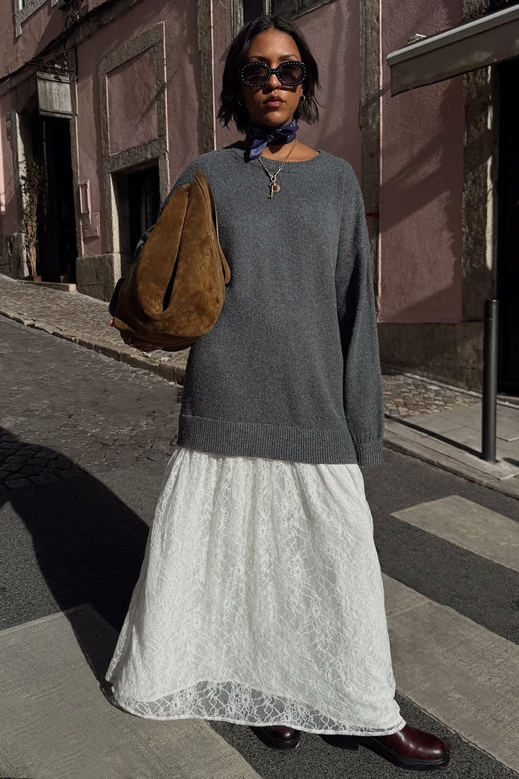 Grey Knit Jumper Dress With Sheer Lace Skirt