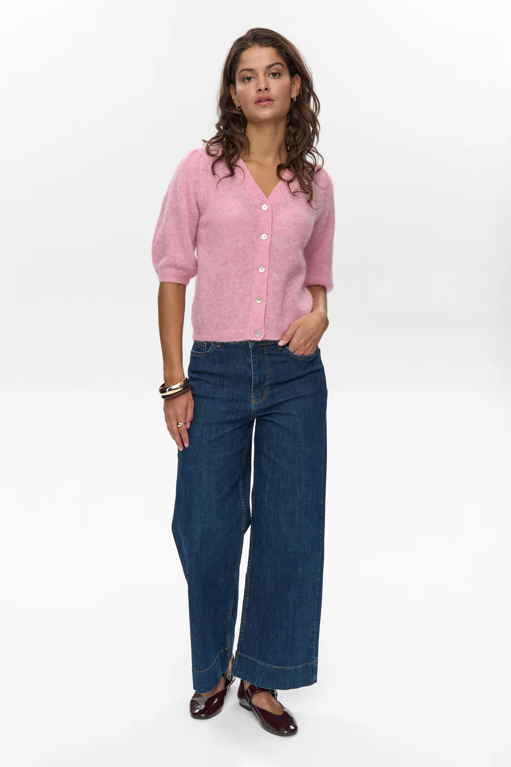 Dusty pink light knit cardigan with 3/4 length sleeves.