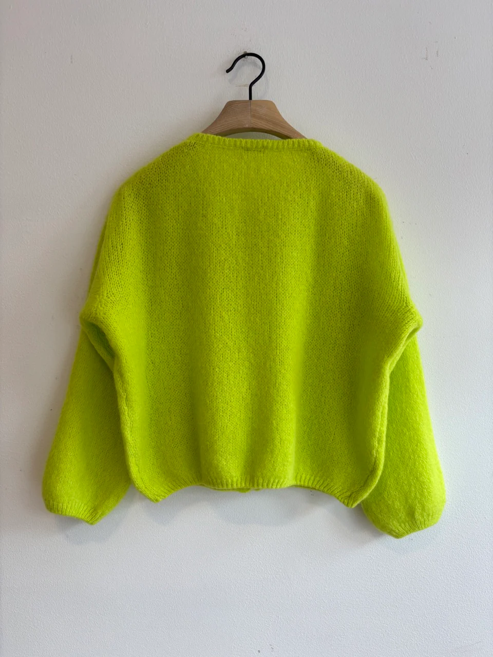 Mohair blend cardigan with shell buttons and long sleeves.Â