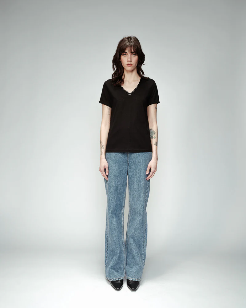 The T-shirt, highlighted by a sequinned trim around the neckline, easily fits into any everyday wardrobe.