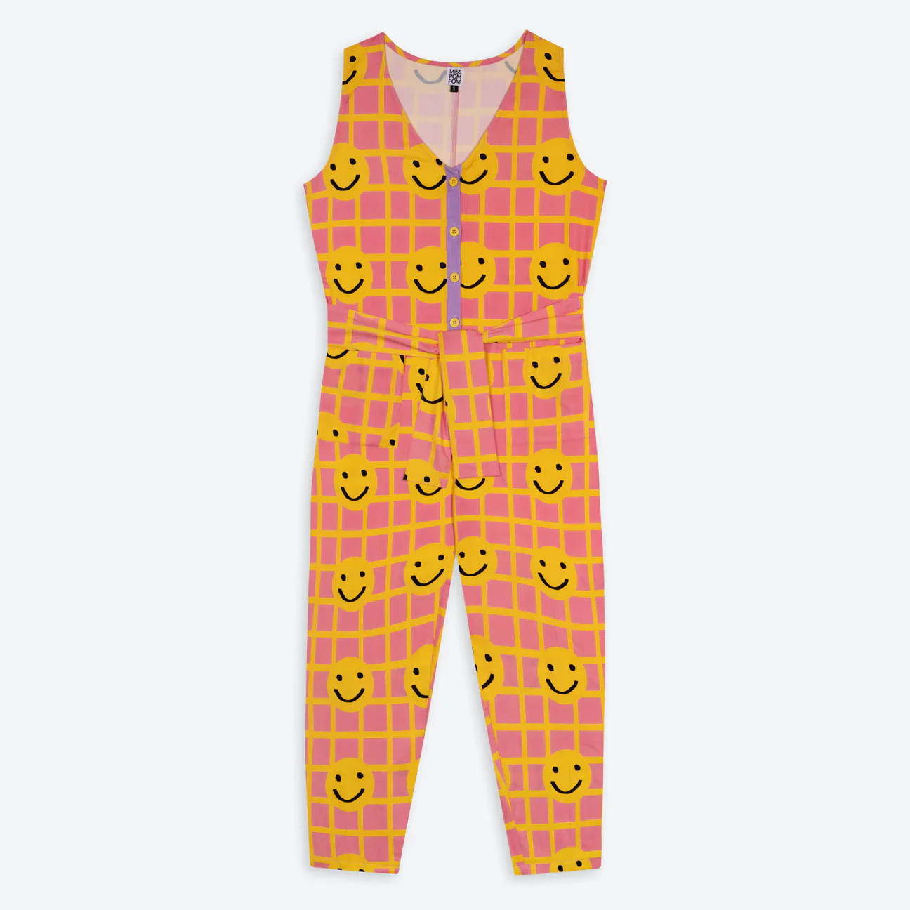 A fun and bright jumpsuit in pink, and yellow check with smiley faces dotted all over.Â